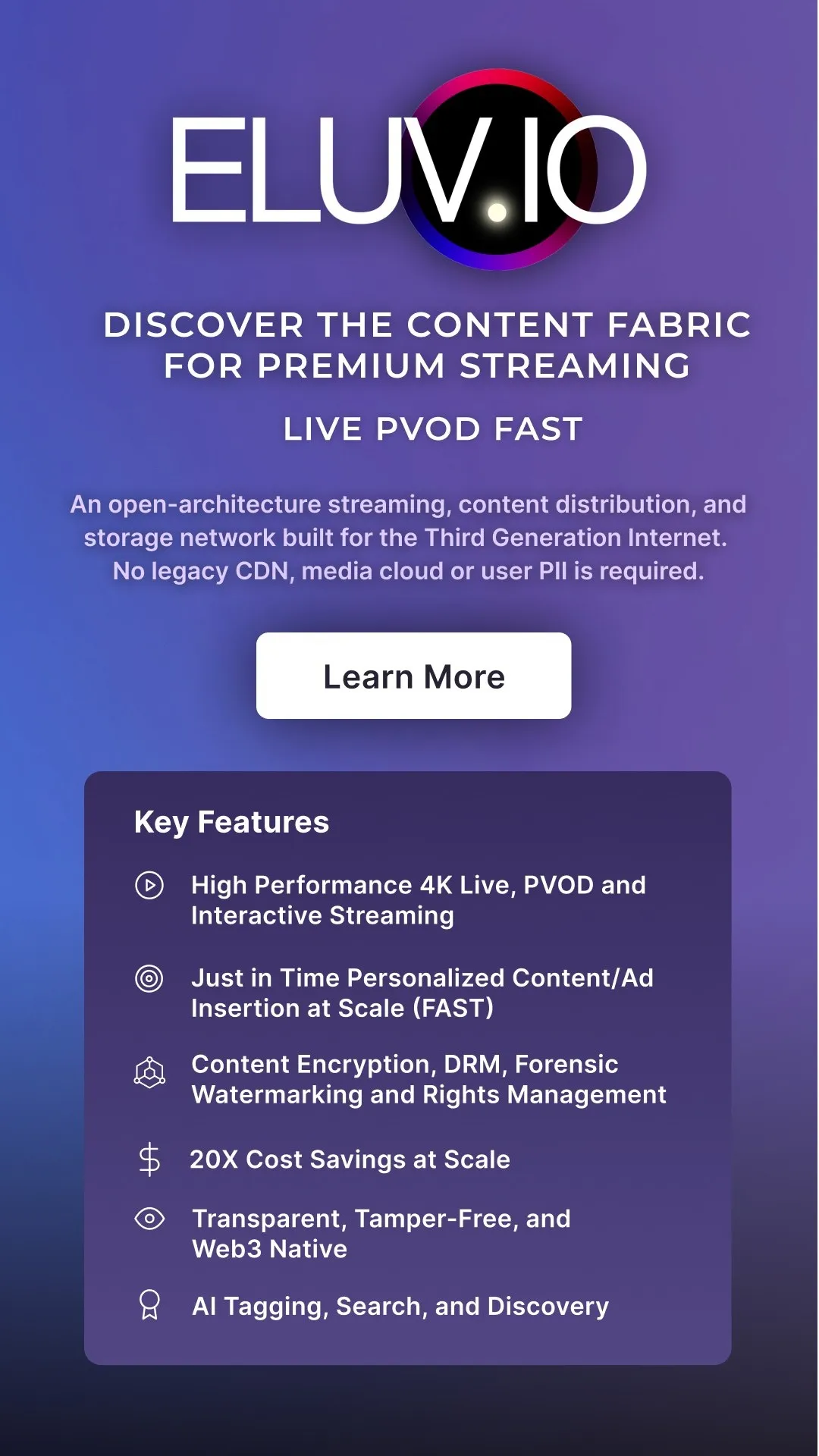 Eluvio (https://eluv.io, https://github.com/eluv-io) is the creator and developer of the Content Fabric (https://eluv.io/content-fabric), a full-featured decentralized media platform. It provides all the functions necessary to build consumer-scale video and media-rich applications in one software stack, replacing conventional media transcoding pipelines and storage (such as AWS), CDNs, DRM services and content management systems.